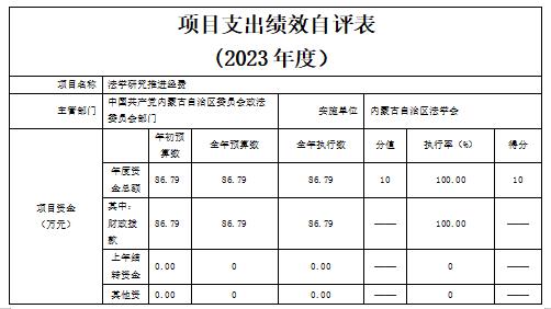 内蒙古自治区法学会 根据预算绩效管理要求组织对2023年一般公共预算项目支出全面开展绩效自评,其中一级项目0个,二级项目1个,共涉及资金86.79万元,占一般公共预算项目支出总额的100%;政府性基金预算项目0个,其中,一级项目0个,二级项目0个,共涉及资金0万元,占应纳入绩效自评的政府性基金预算项目支出总额的100%;(如有国有资本经营预算、社保基金预算、政府债务项目、政府投资基金项目、PPP项目和政府采购及政府购买服务等继续填列)。