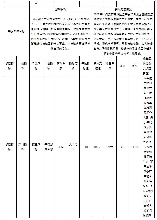 绩效目标实际完成情况:2023年,内蒙古自治区法学会在自治区党委政法委的坚强领导和中国法学会的有力指导下,坚持以习近平新时代中国特色社会主义思想为指导,深入学习贯彻党的二十大精神,全面贯彻落实习近平法治思想和总体国家安全观,全面推进党中央关于法学会工作决策部署落地见效,加强政治建设,繁荣法学研究,服务法治实践,加大法治宣传,积极履职尽责,较好完成了各项工作任务,受到中国法学会的肯定和表扬。