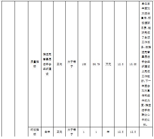 2)推进完善基层法学会组织建设,目标值大于等于108万元,实际完成86.79万元,分值12.5,得分10.05。