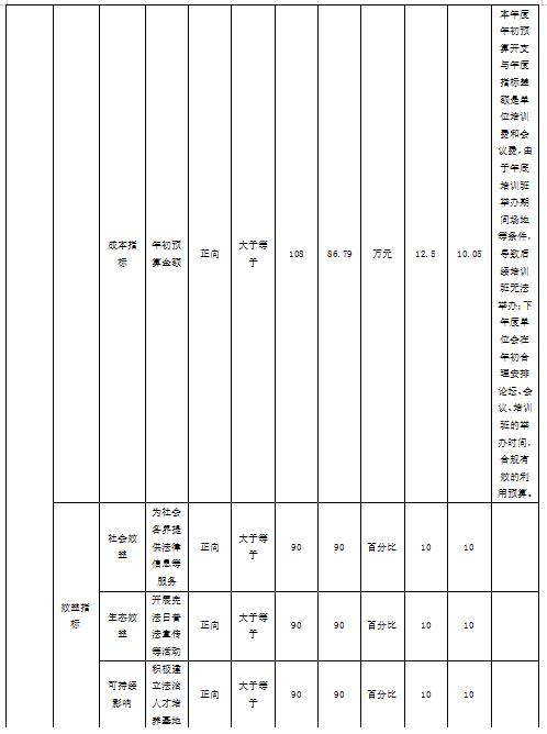 1.法学研究推进经费项目自评综述:根据年初设定的绩效目标,项目自评得分92.65分。全年预算数为86.79万元,执行数为86.79万元,完成预算的100%。项目绩效目标完成情况:按照单位项目绩效评价情况来看,单位项目绩效执行情况良好,预算执行100%,完全按照单位年初总体工作目标和单位职能安排各项工作,做好事前评估、事中监控、事后评价。发现的主要问题及原因:一是,单位领导班子不齐全,工作开展缓慢;二是,开展培训、会议前考虑各方面举办条件时,考虑不周全。下一步改进措施:一是举办培训、会议前,按照相关部门要求,做好事前准备工作,针对场地、人员等条件提前部署;二是健全单位各项管理规章制度,不断学习,强大领导班子人员工作能力 。