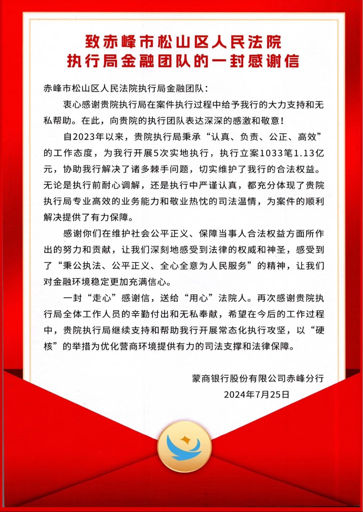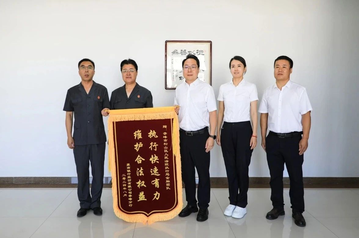 8月28日,蒙商银行股份有限公司赤峰分行的工作人员来到了松山区人民法院,将一面“执行快速有力,维护合法权益”的锦旗和一封感谢信送到了赤峰市松山区人民法院执行局金融团队,对区法院在涉及蒙商银行不良资产清收工作中取得的显著成效表示由衷的感谢。