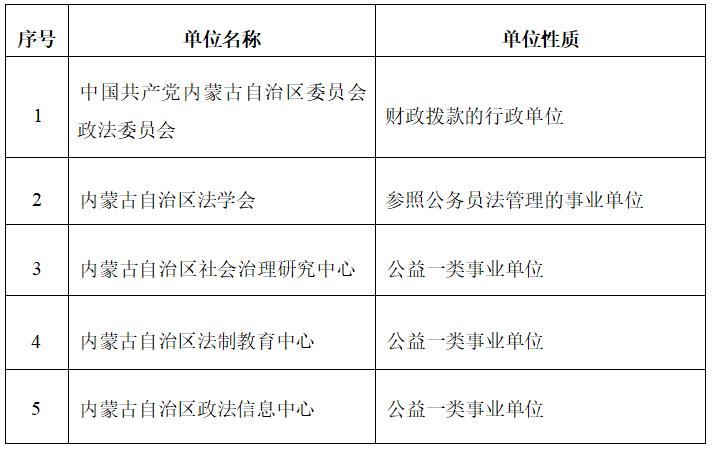 自治区党委政法委是自治区党委领导全区政法工作的职能部门,贯彻执行党中央和自治区党委关于政法工作的方针、政策,统一自治区政法各部门的思想和行动,研究制定全区政法工作的政策和措施,及时向自治区党委提出建议,对一定时间内的全区政法工作作出全局性部署,并督促贯彻落实。中国共产党内蒙古自治区委员会政法委员会下属的参公事业单位有内蒙古自治区法学会,是经内蒙古自治区民政厅批准成立的社团组织,服务于全区法学界和法律界以及为服务于全区政法工作;下属事业单位有内蒙古自治区社会治理研究中心、内蒙古自治区法制教育中心、内蒙古自治区政法信息中心。二级单位均为财政厅全额拨款行政事业单位。