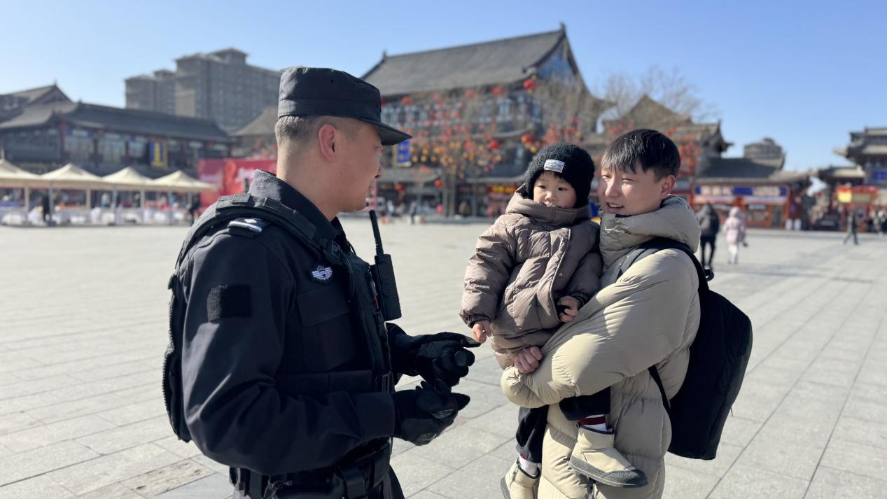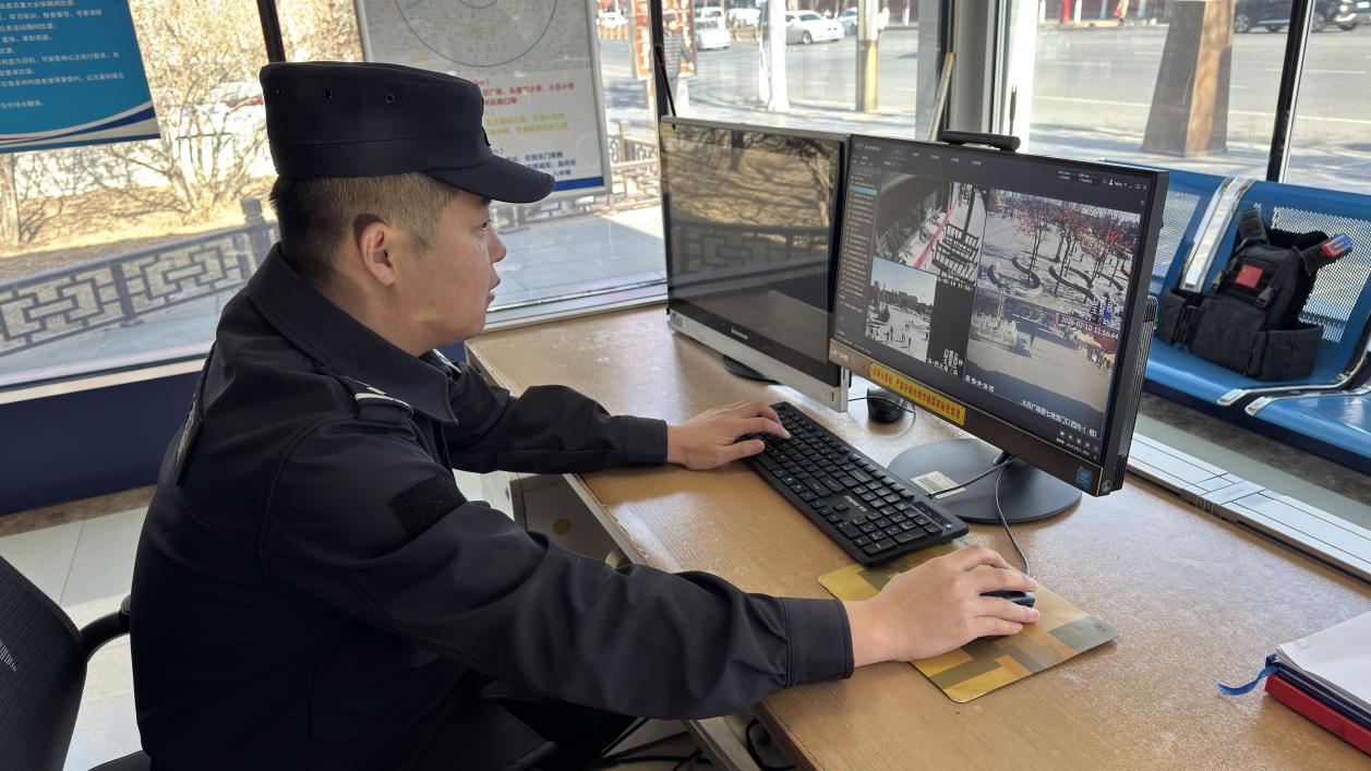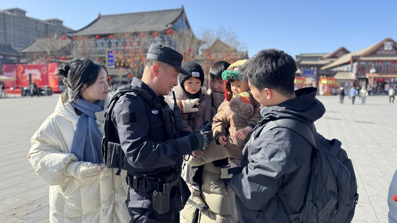 午后,一位来自湖北的游客陈女士急匆匆跑进警务室,眼眶泛红地说孩子不见了。正在盯着监控的刘海强立刻起身安抚:“您别着急,孩子多大、穿什么颜色衣服?”得知孩子今年5岁,穿红色羽绒服后,刘海强迅速将信息同步给许强、白鹏飞。刘海强通过视频监控回溯路线,发现孩子在非遗匠心集被面塑技艺吸引,与家长走散;许强则沿着监控指示的方向快速搜寻,同时用对讲机通知派出所与活动志愿者留意。