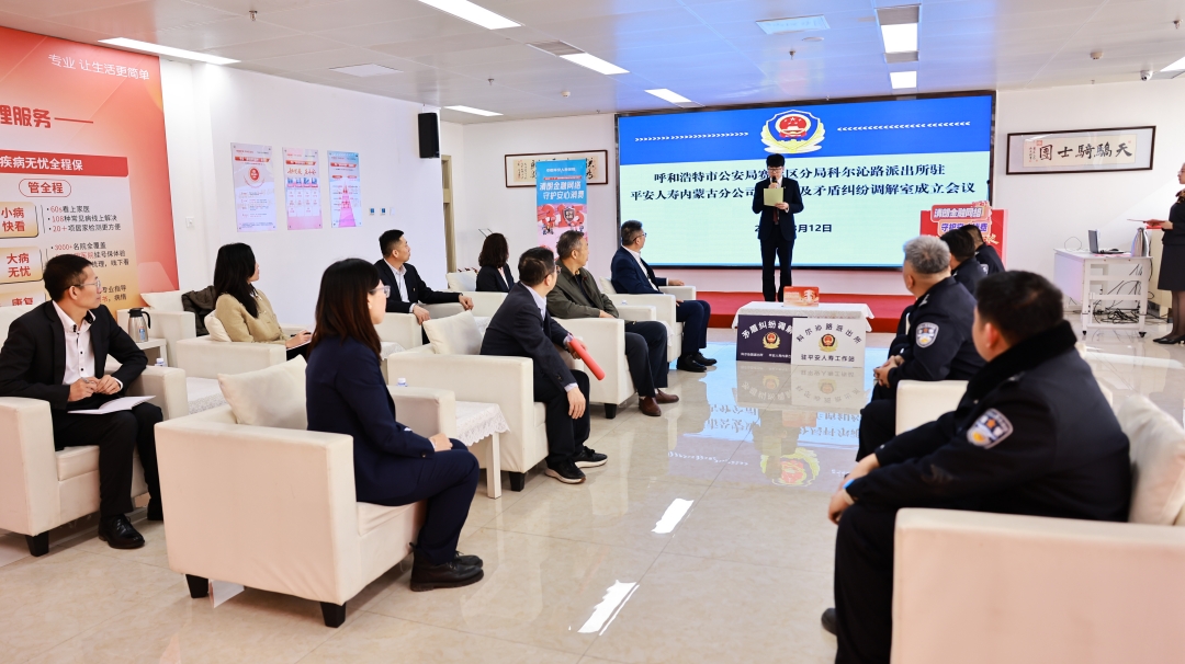 3月12日,呼和浩特市公安局赛罕区分局科尔沁路派出所联合平安人寿内蒙古分公司,在该公司举行“警企联动”纠纷调解机制成立会议暨揭牌仪式,正式设立科尔沁路派出所驻平安人寿内蒙古分公司工作站及矛盾纠纷调解室。此次举措是科尔沁路派出所践行新时代“枫桥经验”、优化营商环境、守护群众金融安全的重要实践,切实将警务职能向金融领域延伸,创新矛盾纠纷化解模式,为构建金融安全与社会治理协同发展新格局注入警务新动能。