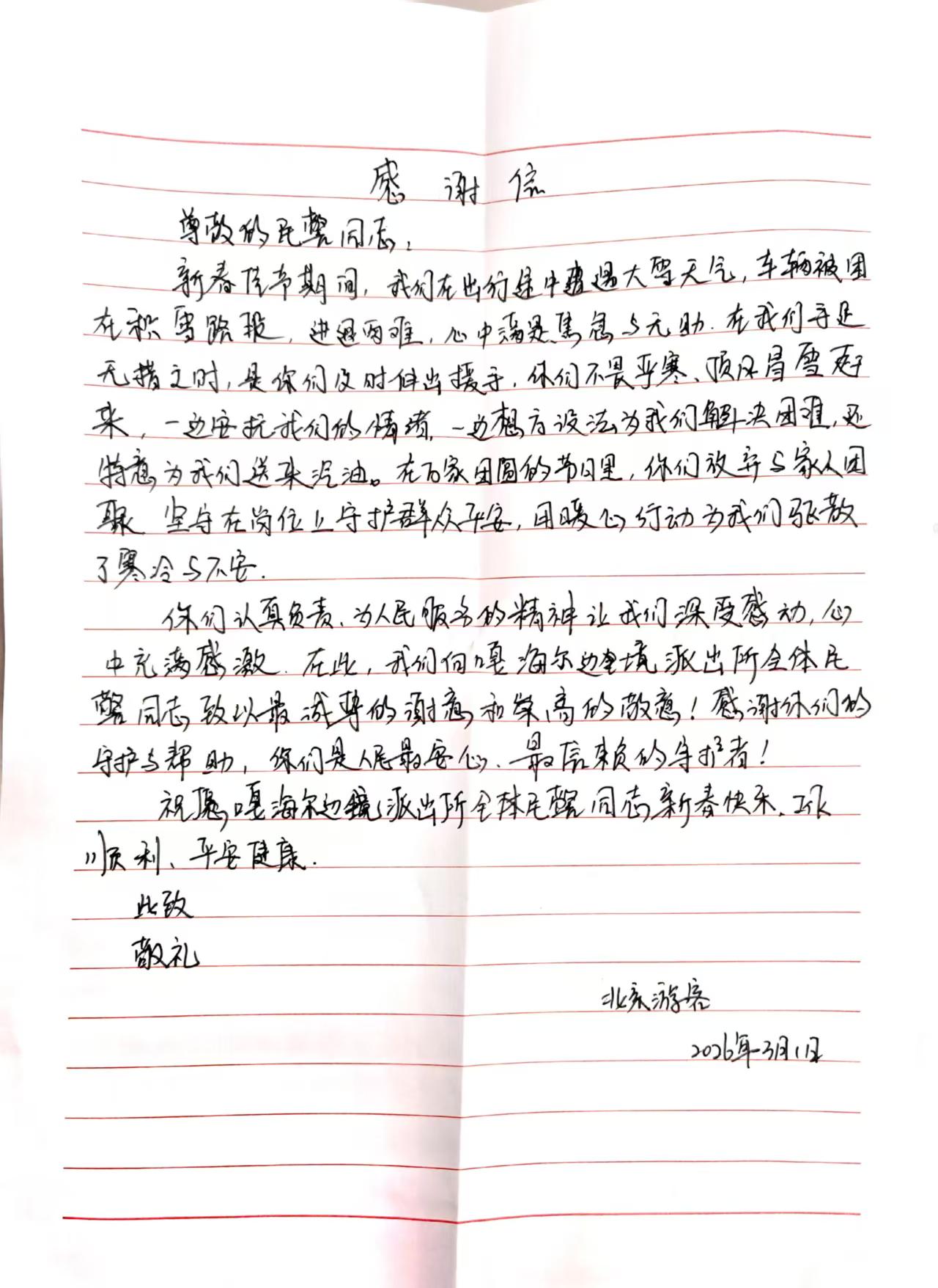 近日,来自北京赵先生的一件特殊快递从北京寄到了东乌珠穆沁旗嘎海乐边境派出所。拆开包裹,是一面红底金字的锦旗,上面印着“人民警察为人民,热心帮助暖人心”。随之一同寄来的,还有一封赵先生亲手写下的感谢信,他以最质朴的方式,表达着对戍边卫士们的诚挚谢意。